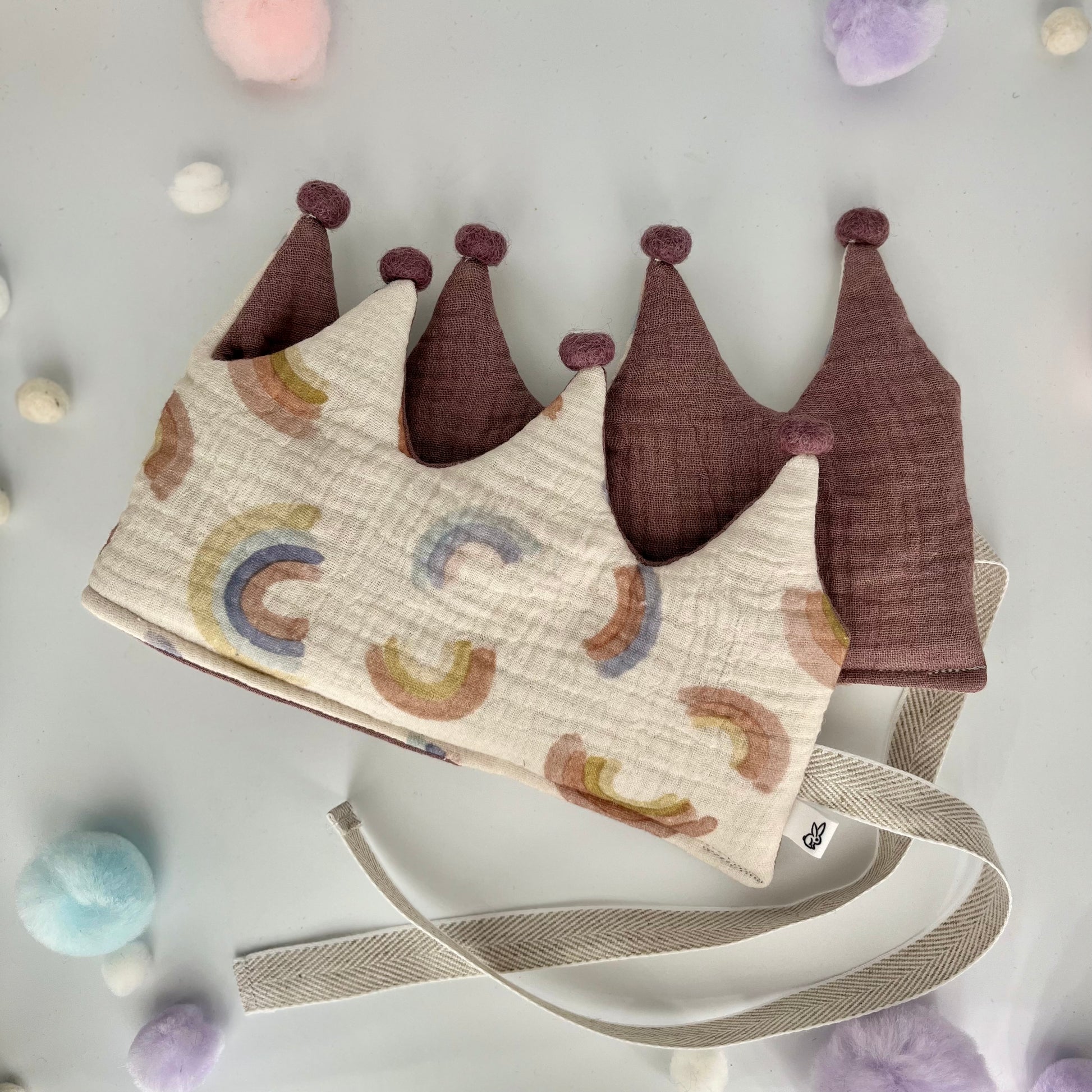 Stoffkrone | Geburtstagskrone Regenbogen aus Musselin und Pompons *yep.lets.celebrate*